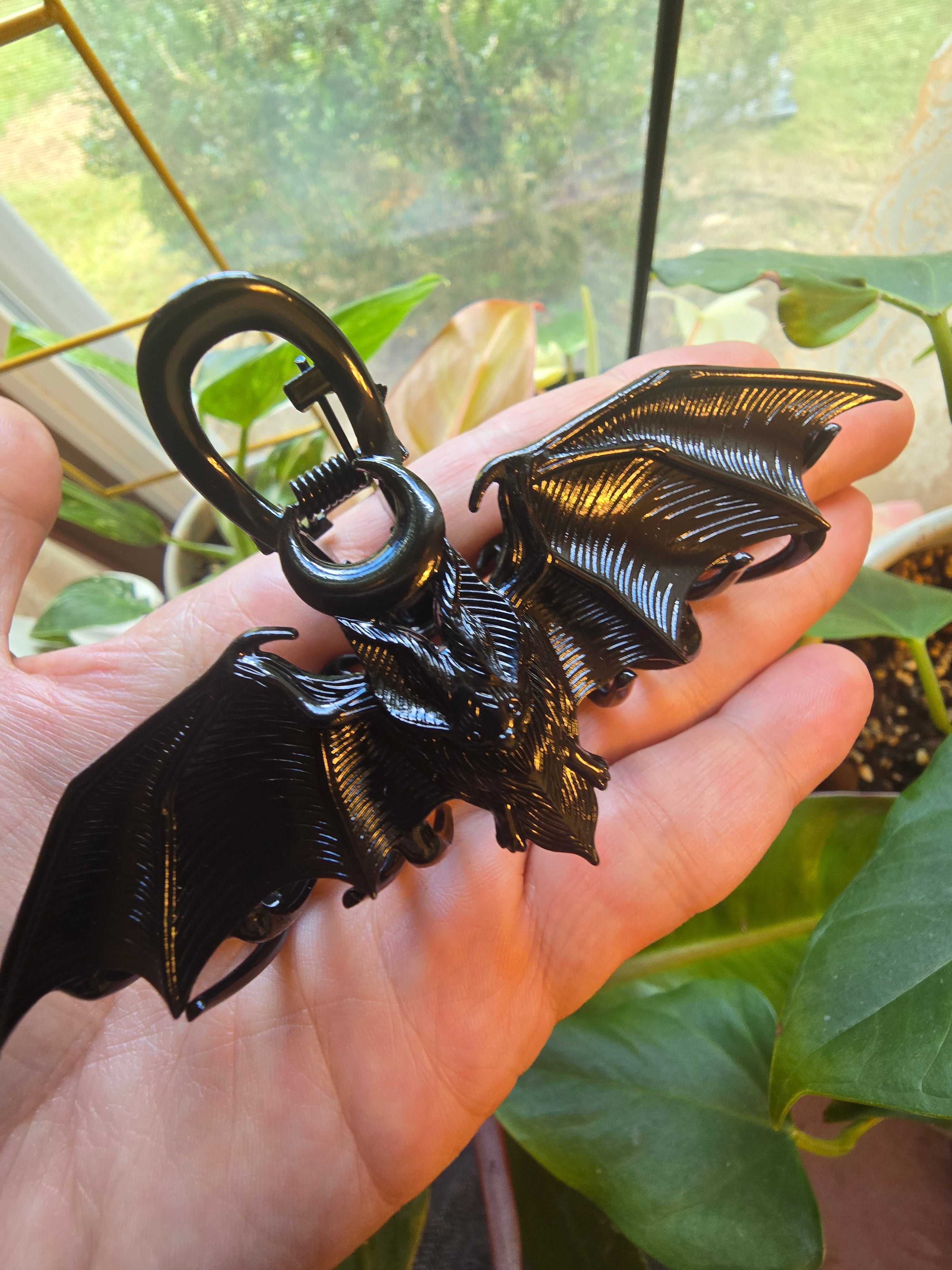 This batty claw clip adds a whimsical touch to any look while keeping your hair securely in place. Crafted from a sturdy zinc and steel blend, it combines delicate detailing with everyday strength. Measures 3.5 inches long and 2 inches tall—perfect for half-up styles or sweeping your hair off your neck with a hint of char