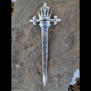 The hilt of the Hair Sword is adorned with a fleur-de-lis, symbolizing the Trinity and its sacred unity. Each petal reflects the Father, Son, and Holy Spirit, underscoring the three-in-one nature of God. A triptych of crosses further highlights this unity, while the crown represents the Father's divine sovereignty, a reminder of God’s majesty and dominion.