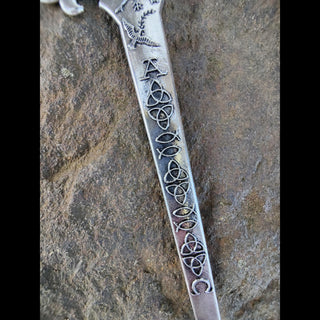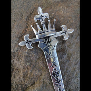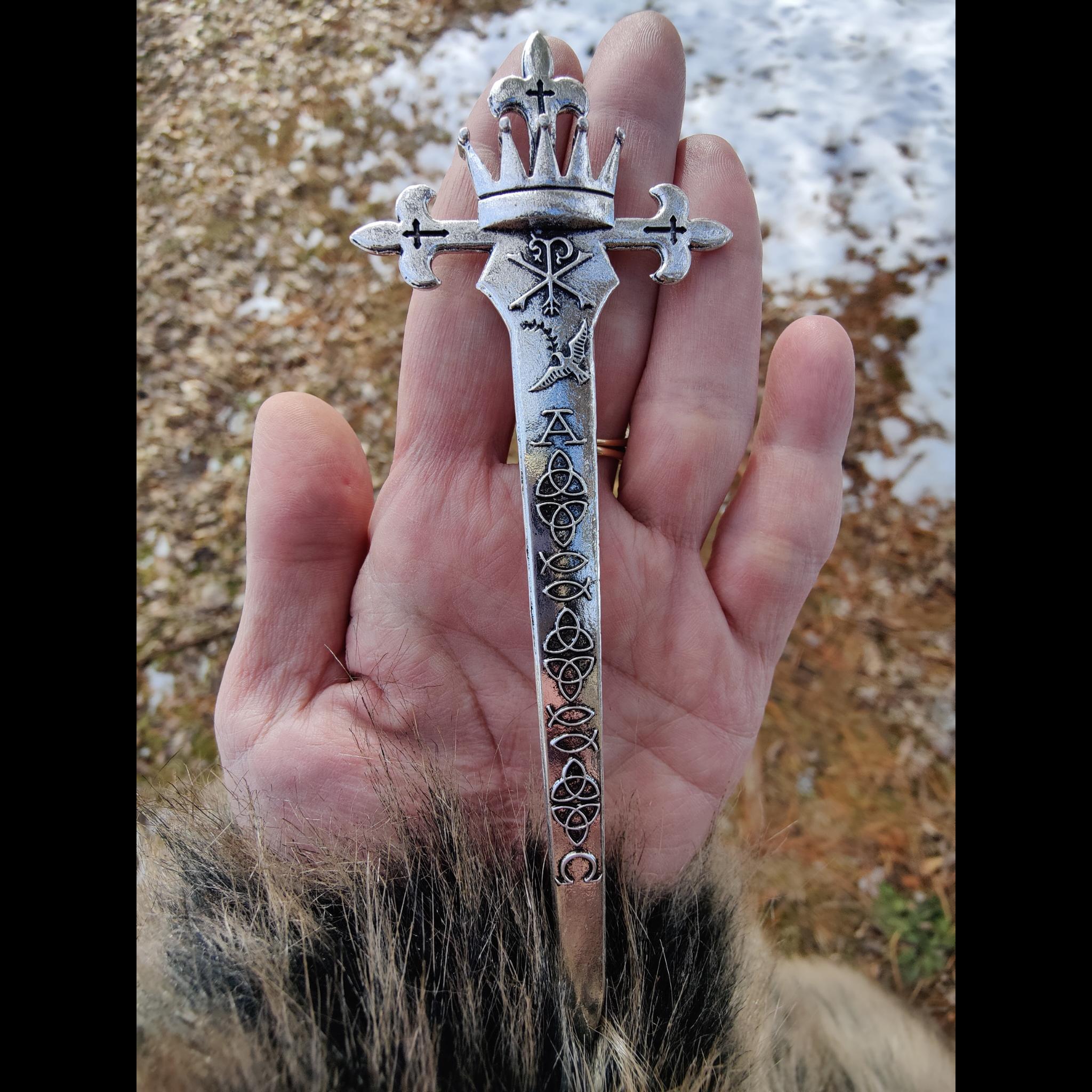The blade of the Hair Dagger tells a story of faith and eternity. It begins and ends with the Alpha and Omega, emphasizing God as the beginning and the end, the eternal Creator who encompasses all time and existence. Between these symbols are the Triquetra, representing the Trinity’s unity, and the Ichthys, the fish symbol affirming Jesus as the Son of God and Savior.