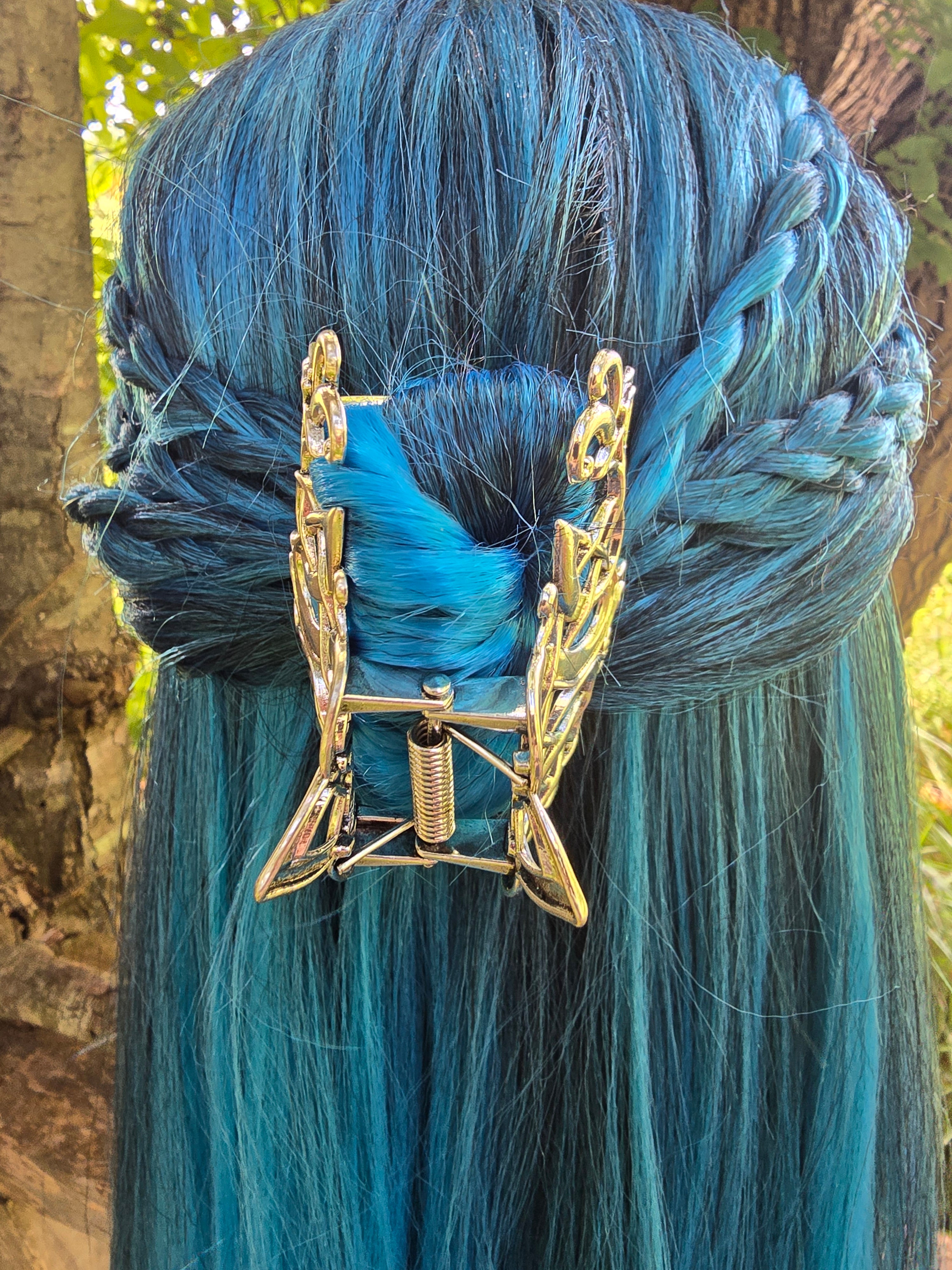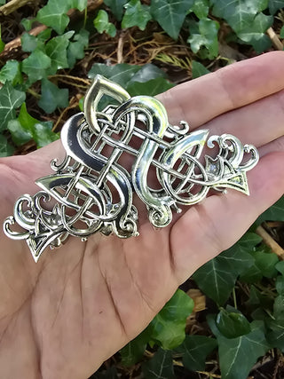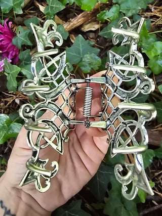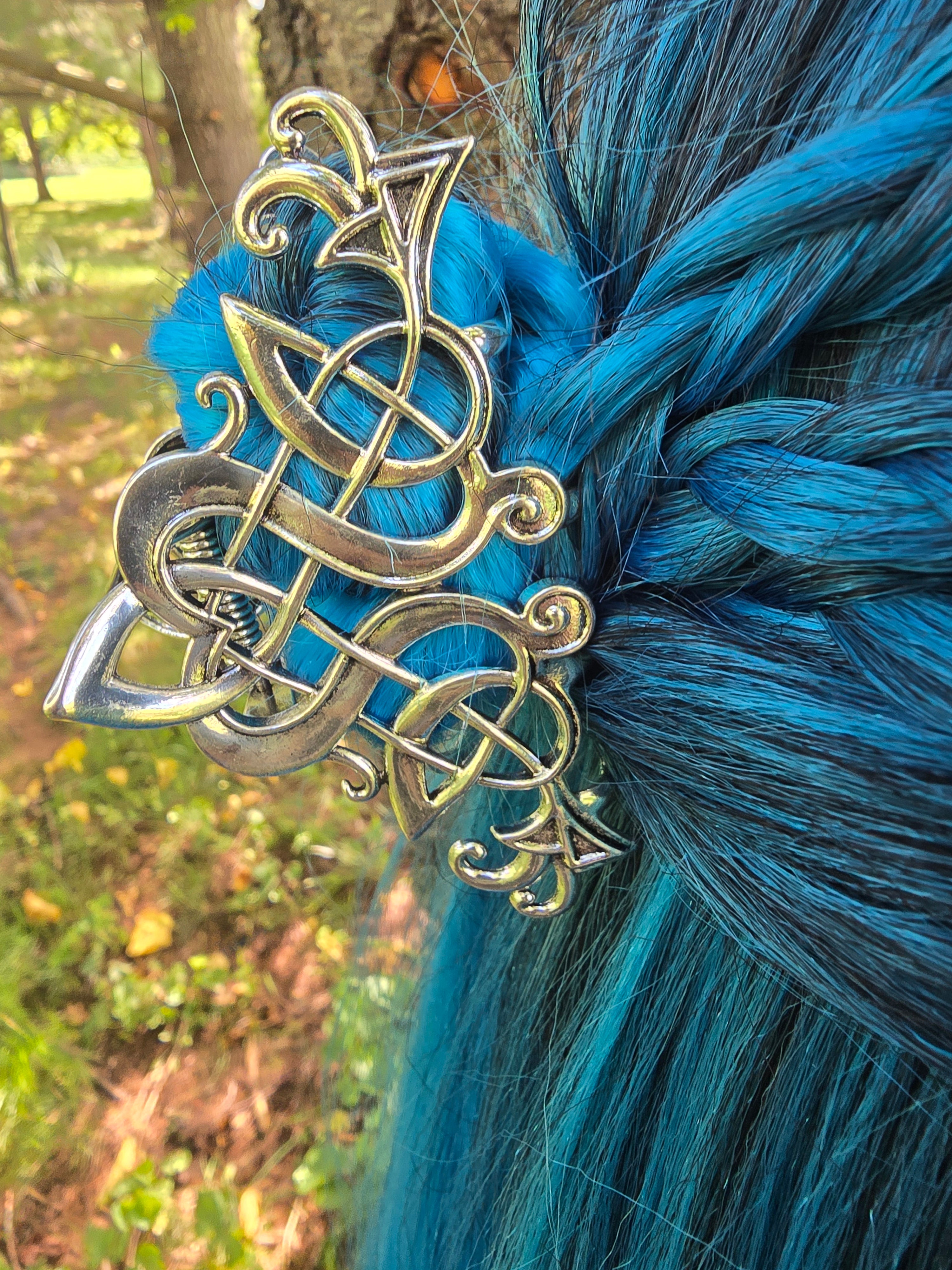 The Celtic Filigree claw clip adds a whimsical touch to any look while keeping your hair securely in place. Crafted from a sturdy zinc and steel blend, it combines delicate detailing with everyday strength. Measures 3.5 inches long and 2 inches tall—perfect for half-up styles or sweeping your hair off your neck with a hint of char