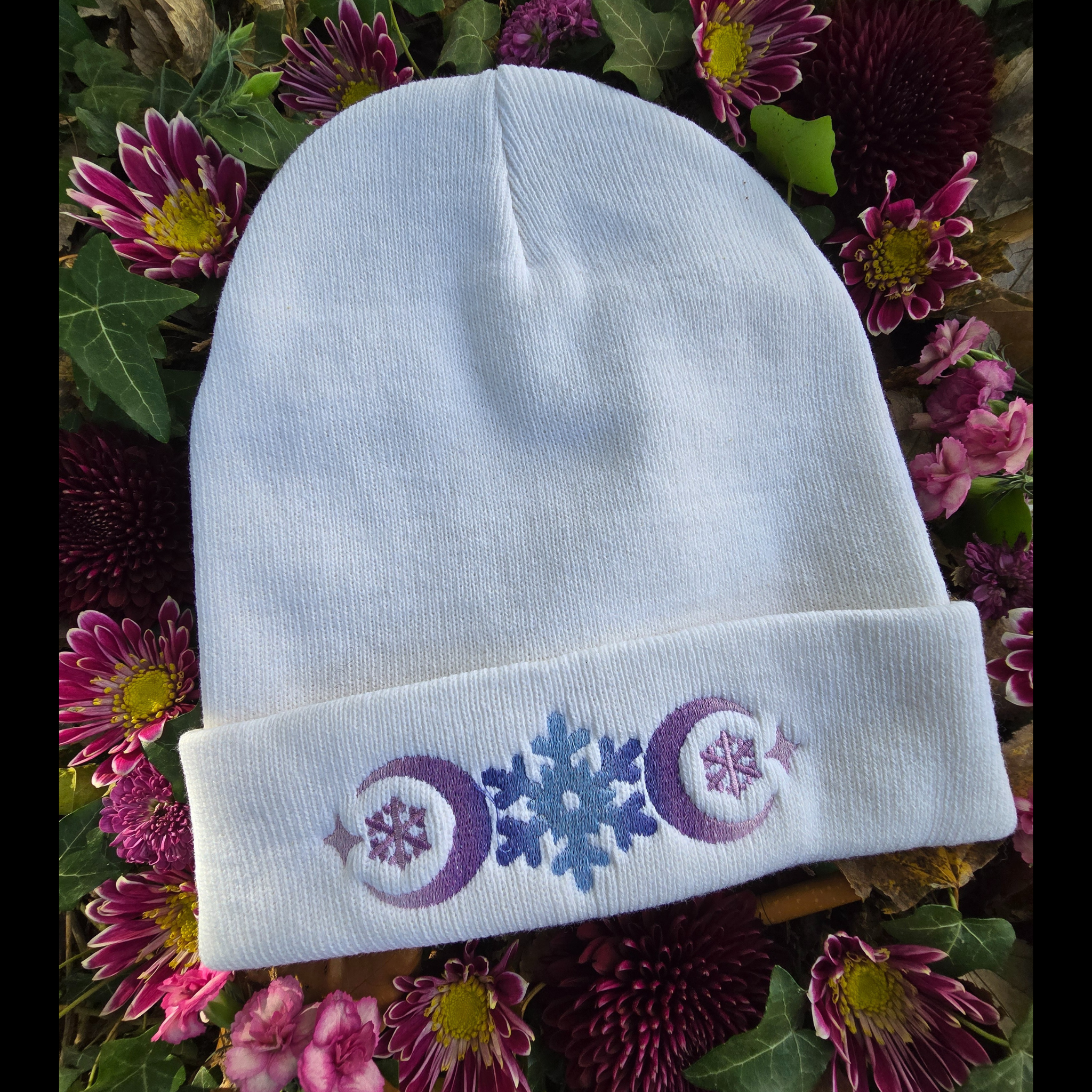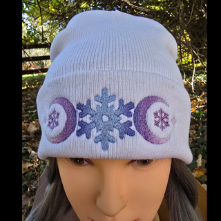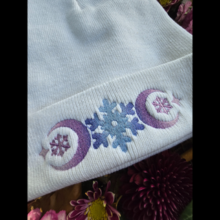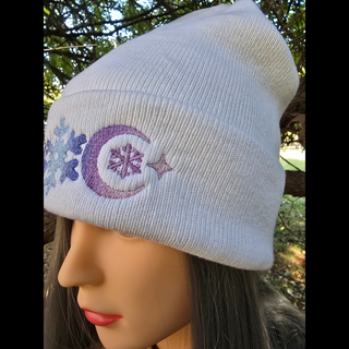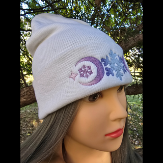 Stay warm and stylish in a cozy knit beanie.  Features a an enchanting embroidered snowflake and crescent moon motiff. The yarn is hand dyed during the embroidery process to give it a sugarplum ombre effect.