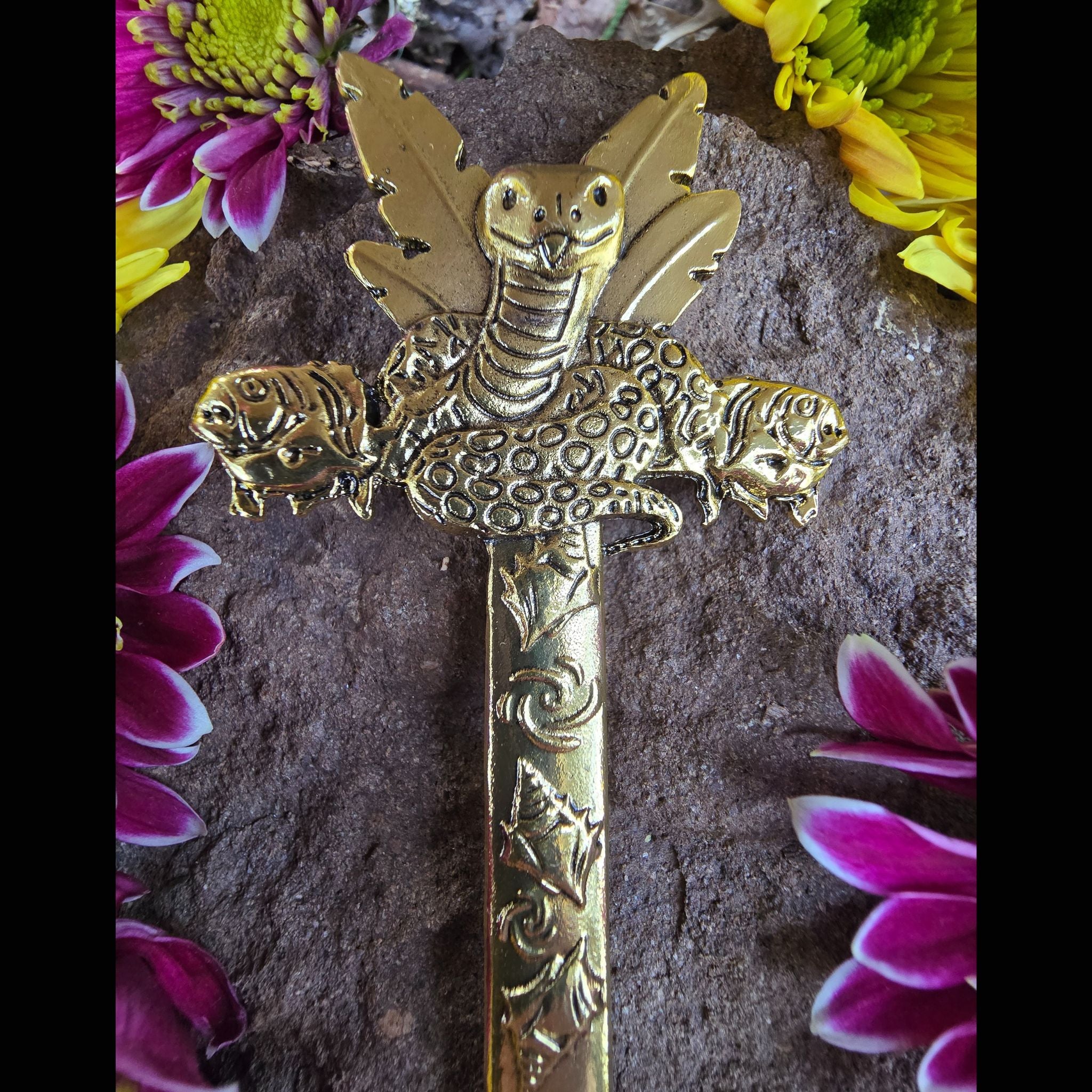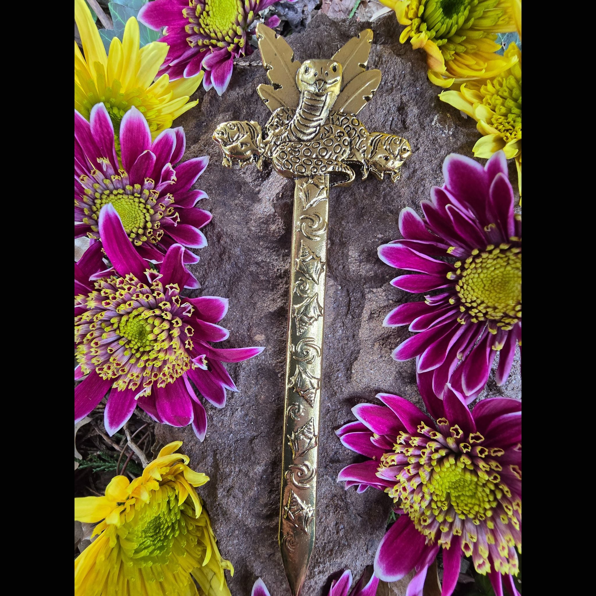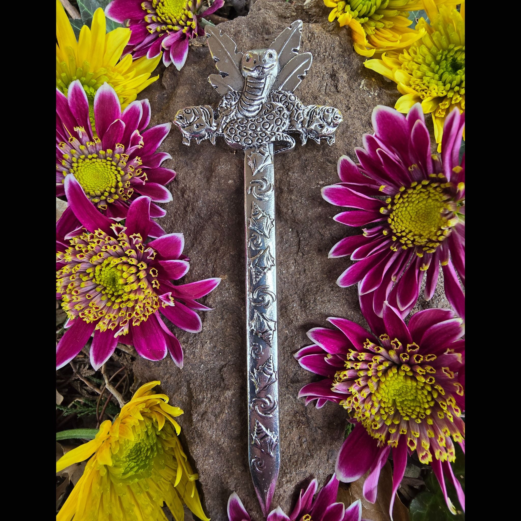 Uses: while it is designed to be a hair-stick, hair-sword, or hair-dagger, it can also be used as an athame, altar decor, letter opener, bookmark, decor for a potted plant, a prop for an art doll, or tucked into a belt, thigh garter, or hat band. I'm sure there are even more ways to slay.
